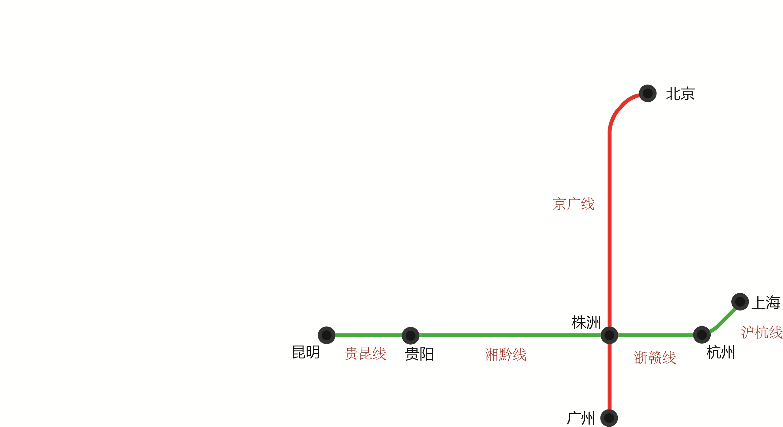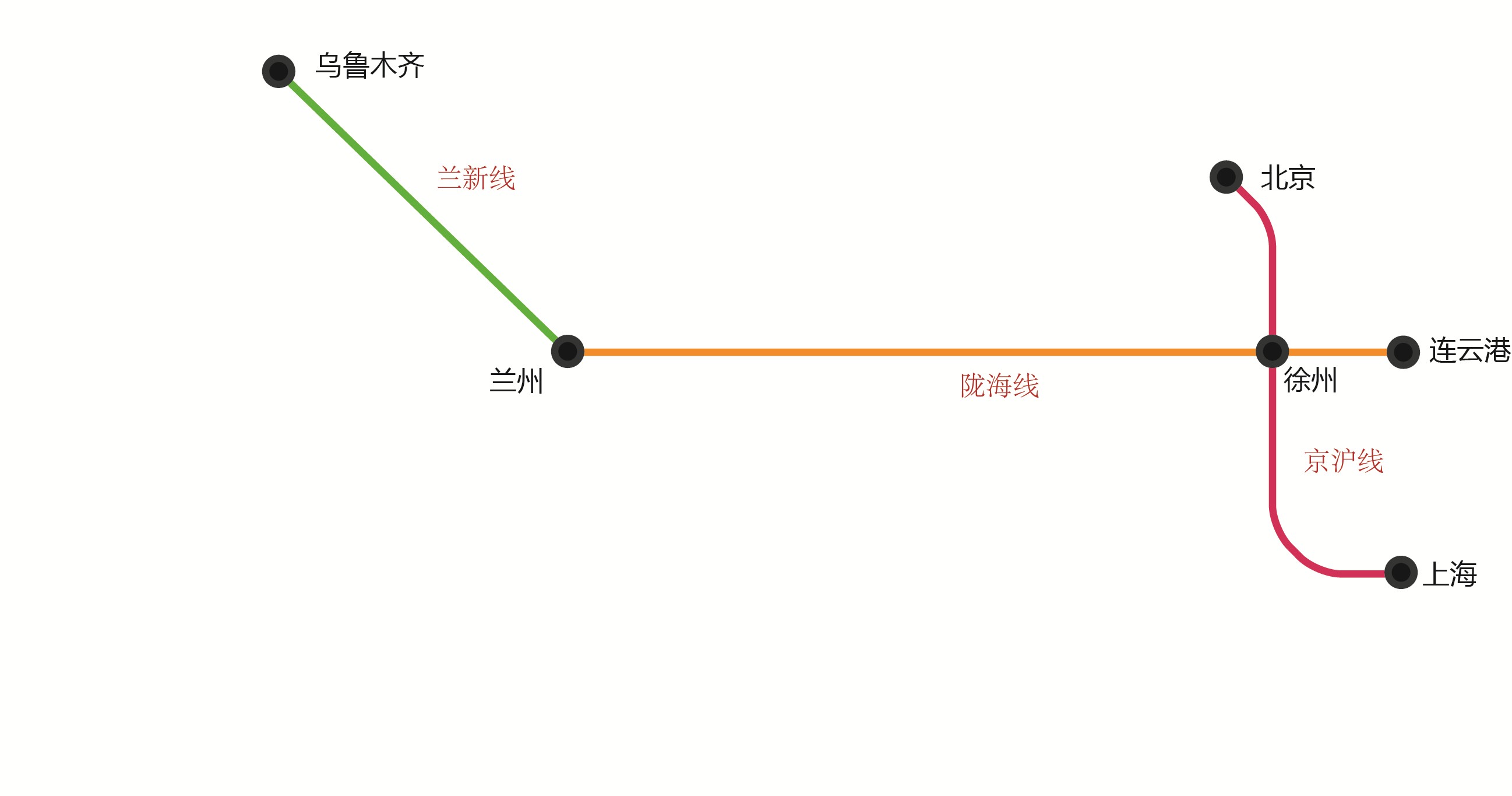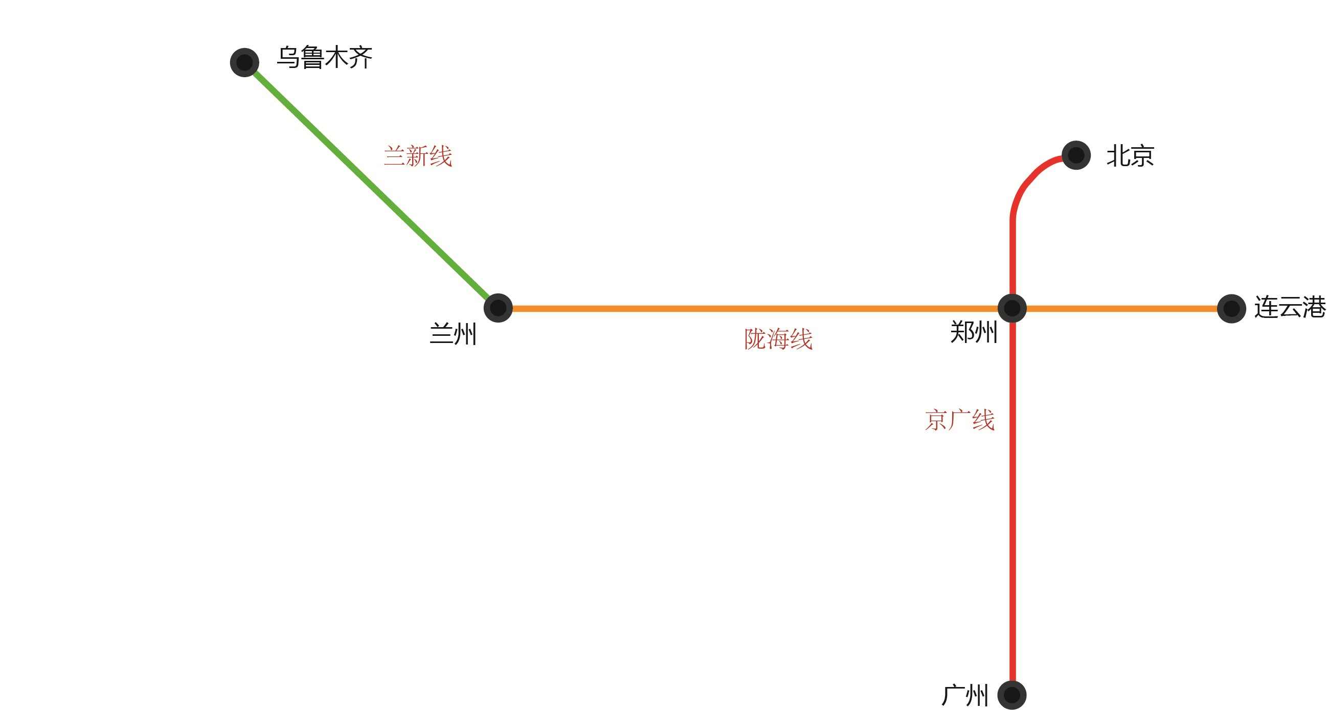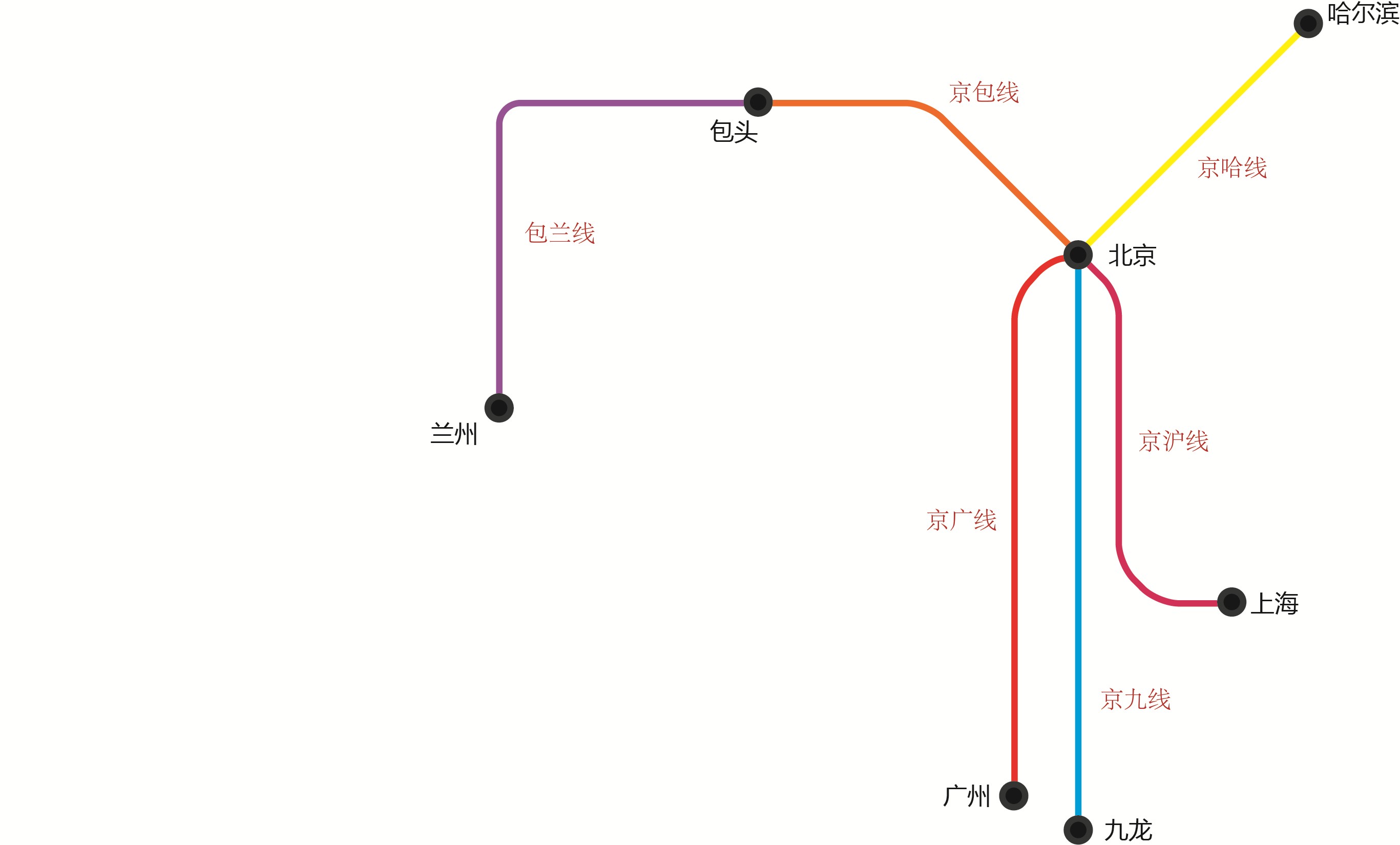 为了使得线路图简洁,通过类似地铁图的方式来画这几条铁路干线和主要铁路枢纽城市