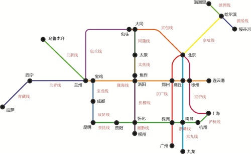 京哈——京广线、京九线、京沪线、北同蒲线——太焦线——焦柳线、宝成——成昆线、兰青——青藏线