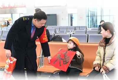 一句句祝福跃于纸上,浓浓的情意传递于字里行间。“今天我们准备了200副春联和100个‘福’字,把平安、祝福送到旅客手中。”市文联党组成员、副主席丁敬文说。