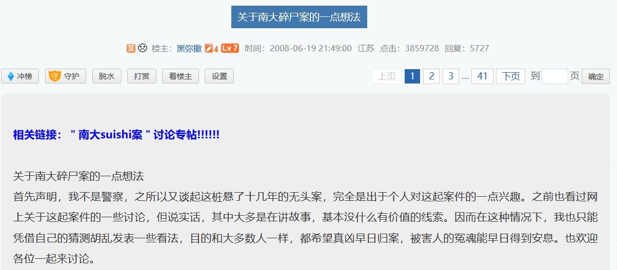 一位叫黑弥撒的网友发帖关于南大碎尸案的一点想法。在这个帖子里,黑弥撒认真分析了凶手的动机、身份、作案手法。他指出,受害者非常喜欢摇滚乐,尤其是重金属和哥特摇滚,可能是因为这方面的爱好而和凶手认识并上钩。他还提醒警方要注意这样的人,男性案发时年龄在30岁至40岁之间,亦有可能在30岁以下,相貌端正,气质成熟稳重,性格内向,为人谦和,单身,受过高等教育,文化素质较高,喜欢听音乐,也有可能爱好文学,住在南大附近,独居,懂得一些医学方面的知识,但没有人知道。