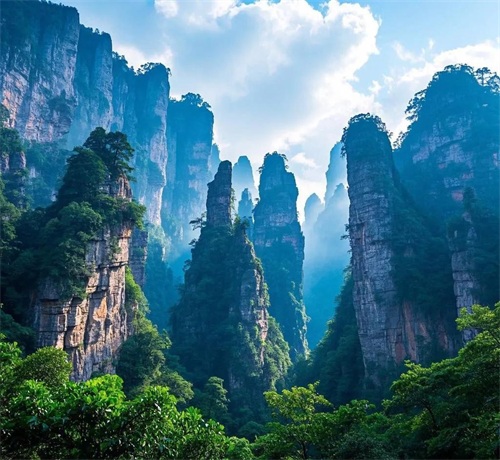 张家界国家森林公园以其奇特的砂岩峰林著称,这里的山峰形态各异,仿佛是大自然的艺术品。在这里徒步探险,你会发现自己仿佛进入了另一个世界。别忘了带上你的相机,记录下这一路上的美景。