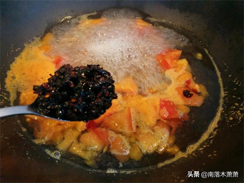 然后盛出一勺老干妈,想吃口味重的就多加点,这个看个人口味。煮沸,让西红柿和老干妈融合到一起真是香气扑鼻。