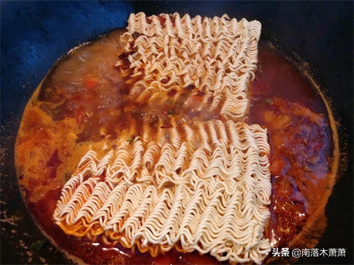 等到老干妈西红柿汤汁再一次沸腾,然后放入方便面面饼,这时候同时将方便面的调料包放进汤汁里一同煮沸。
