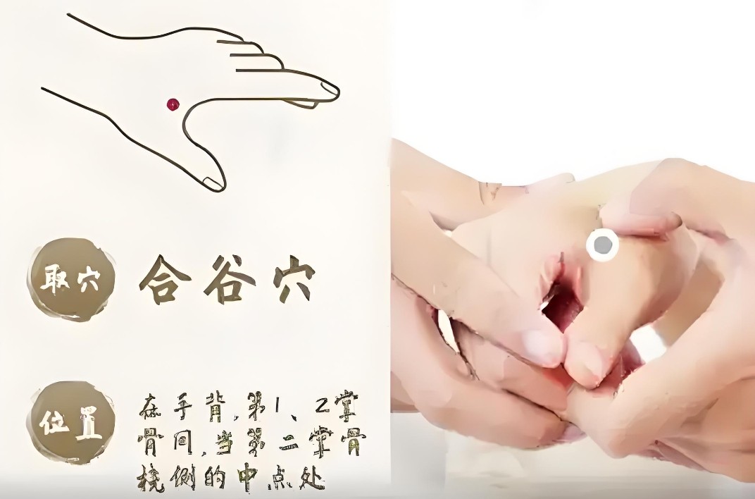 2. 用签字笔帽轻旋合谷穴,化解内热上火