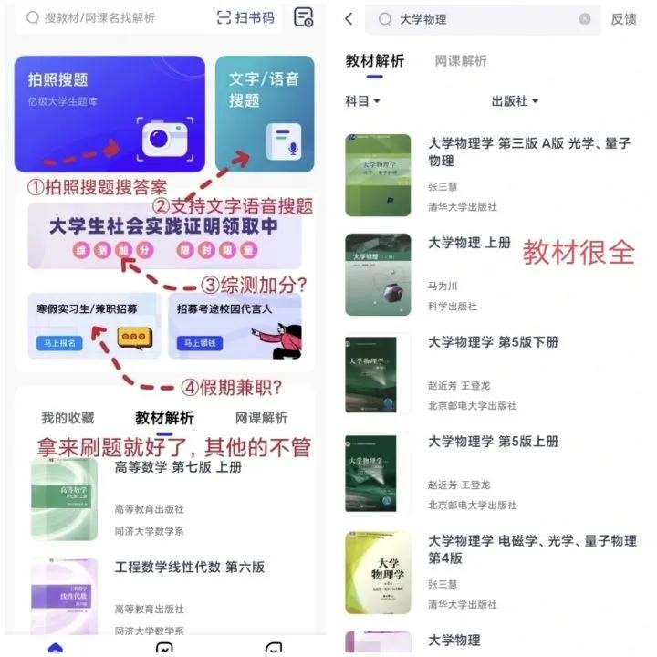 支持拍照、文字搜题,教材和网课的答案都很齐全,还有备考资料和真题在线解答,题库比较适合理工科目,他好用的地方在于能搜到一些很偏的题目,找不到原题也能找到类似的题型,可以提供解题思路,缺点是文科类的题量相对其他软件比较少,解析几乎没有