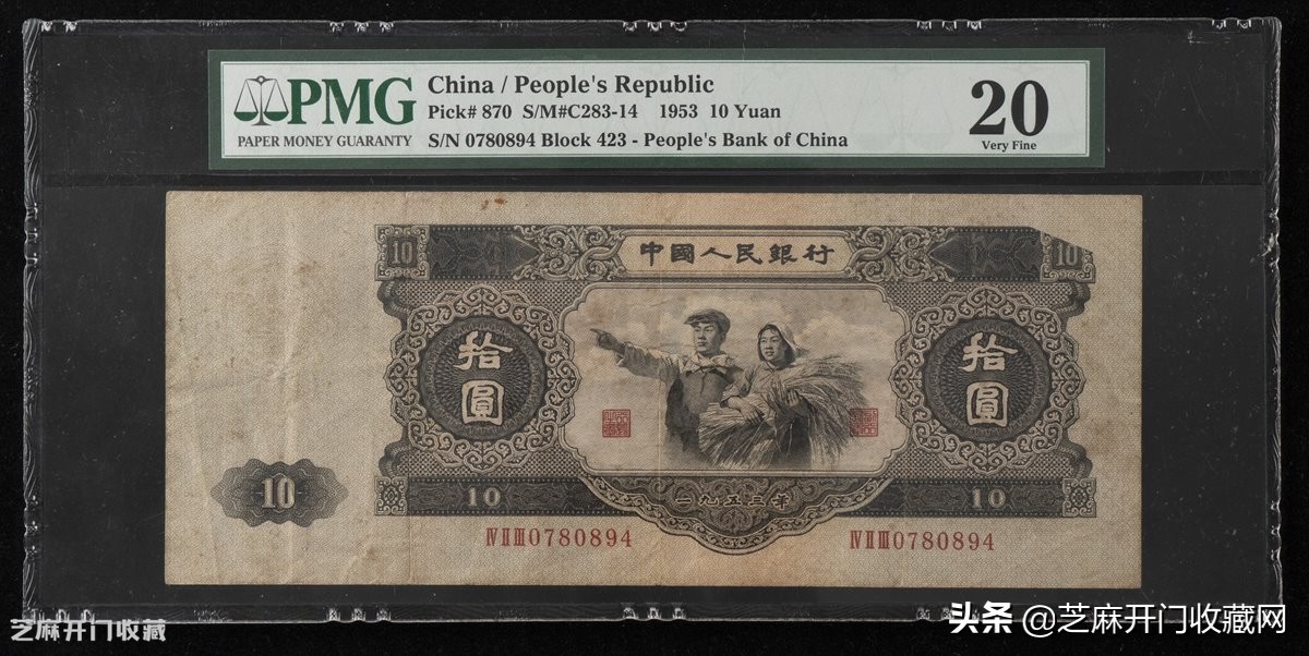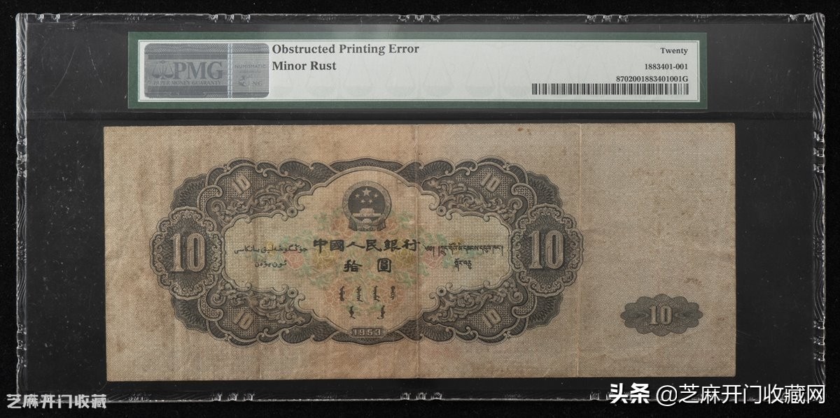 1:1953年第二版人民币拾圆一枚,漏印,罕见,PMG 20,估价: RMB 200000,成交价格: RMB 517500
