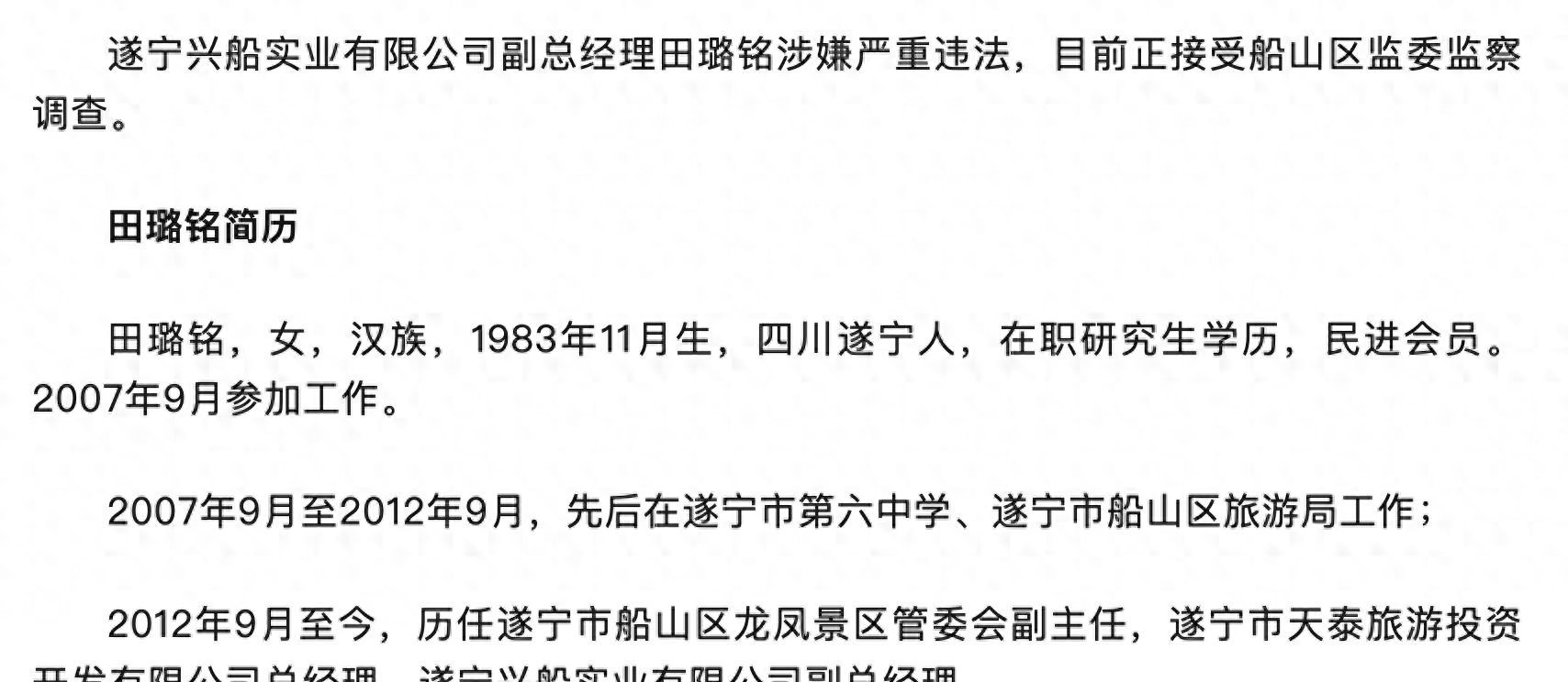 先说说这位田璐铭。简历显示,她是个80后,妥妥的“高知女性”,在职研究生学历,还是民进会员。从2007年参加工作以来,她的履历看着也挺漂亮:先是在学校和旅游局工作,后来一路升迁,成了龙凤景区管委会副主任、天泰旅游公司总经理,最后是兴船实业的副总经理。这妥妥的人生赢家,怎么就……