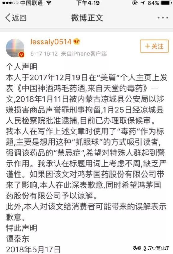 在巨大的压力和精神折磨下,事件以谭秦东公开发布了对鸿茅药酒的道歉声明,在声明中表达了自己的悔意和对鸿茅药酒的歉意而结束。
