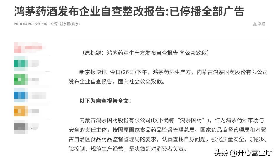 鸿茅药酒发布企业自查整改报告:已停播全部广告 新京报 2018-04-26