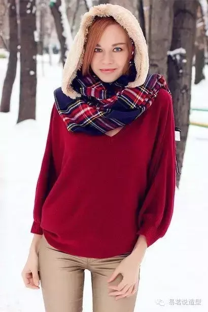 再比如浅灰色格子裤,加上驼色毛衫,外搭一件酒红大衣。