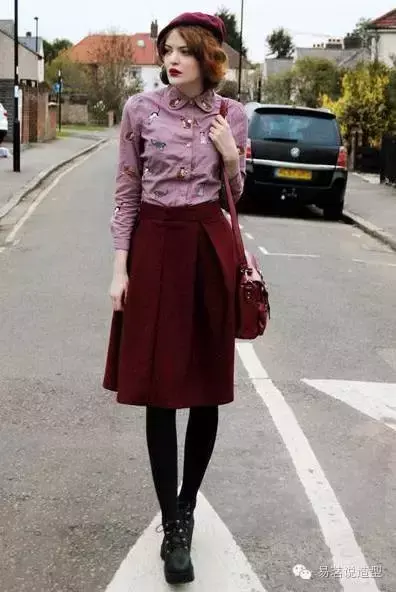 比如小面积的刺绣碎花图案,结合粉色上装,搭配酒红百褶裙,