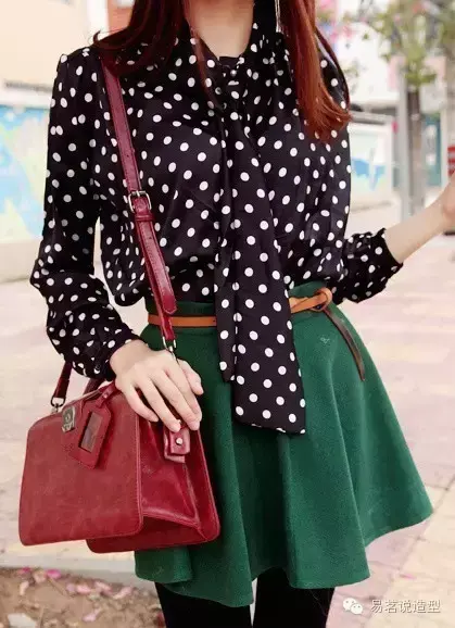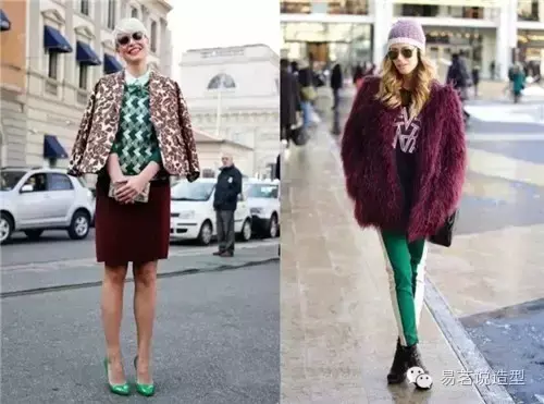 但是大胆的潮人们不甘平庸,她们选择暗一点的酒红色,搭配绿色,就使违和感降低了不少。