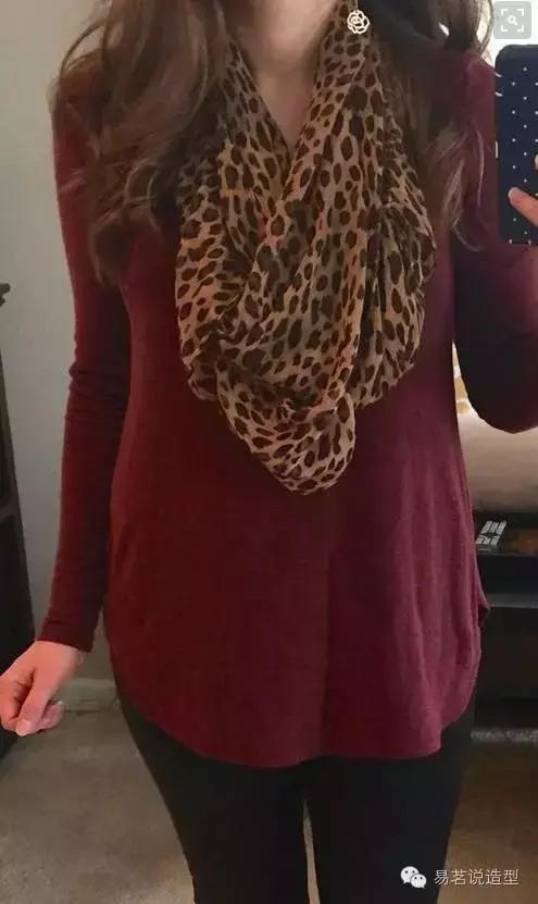 围巾、手包都可以搭配起来。看下图,酒红色的提包才是全身的亮点,否则光是豹纹黑白搭也没有那么出众。