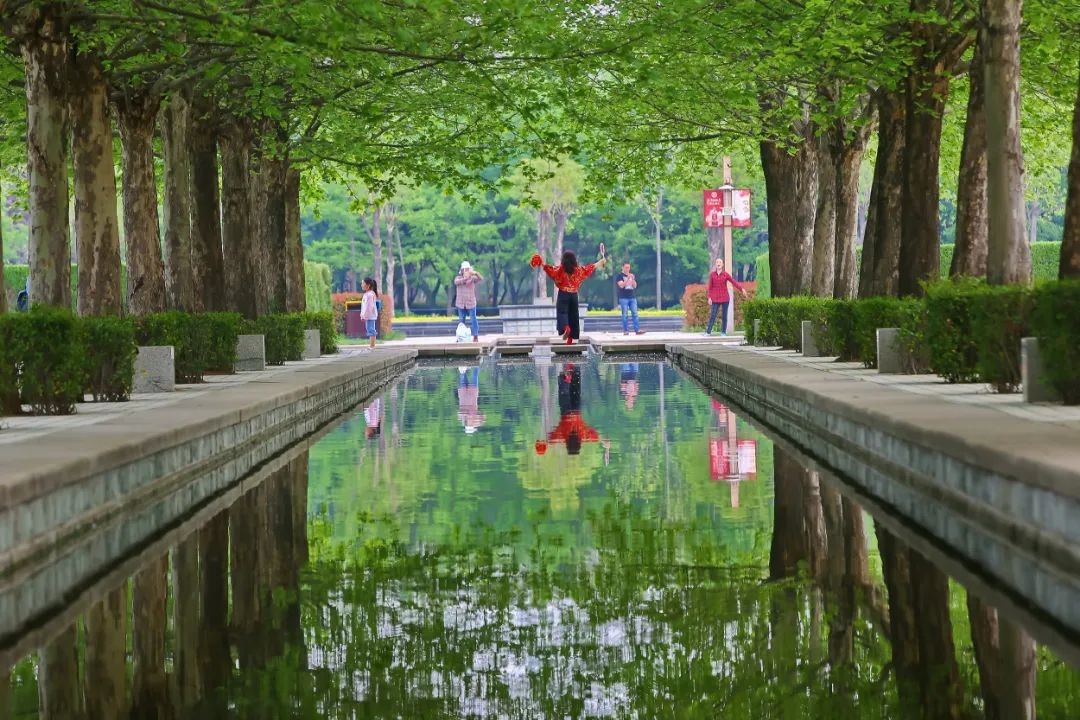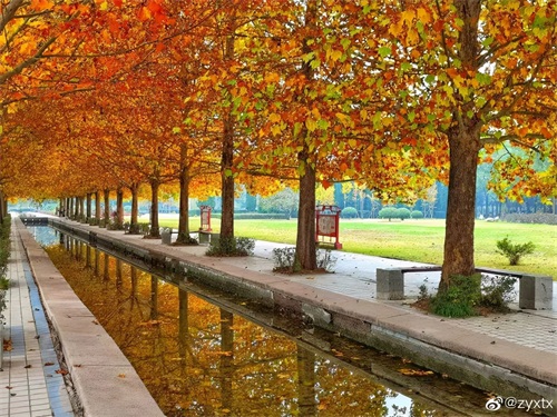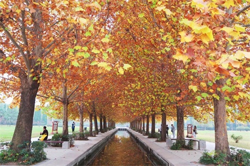 位于隋唐植物园的外来植物园处,有这样一处打卡地,悬铃木叶子泛黄,水面上映衬着树木的倒影,树叶飘落在地面,踩上去,耳边回响着沙沙声~