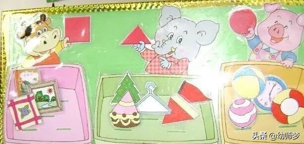 玩具玩法:幼儿通过对实物图片的观察,并将其按形状分类,将小图形宝宝分别送回家。