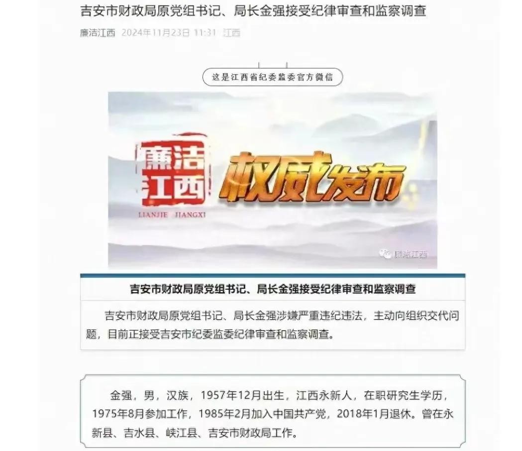 近日,一则令人震惊的消息在江西省吉安市传开:吉安市财政局原党组书记、局长金强因涉嫌严重违纪违法,正在接受吉安市纪委监委的纪律审查和监察调查。这位已经退休七年的官员,再次成为公众关注的焦点。