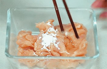 14、鸡肉中加入芡粉,搅拌均匀。