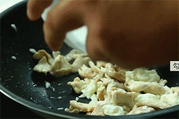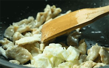 13、鸡肉、蛋清翻炒均匀。