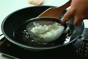 8、蛋清放入热油中,轻轻搅拌,炸1分钟左右。