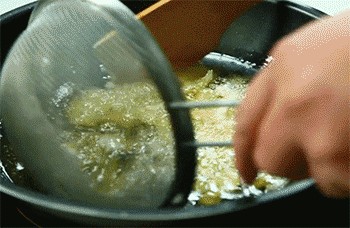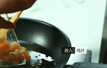 10、鸡片放入热油中,炸至变色。