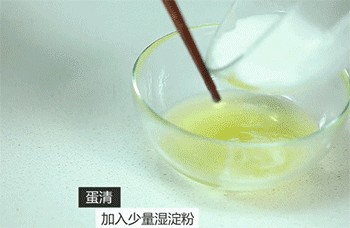 6、在鸡蛋清中加入少量的湿淀粉,搅拌均匀。
