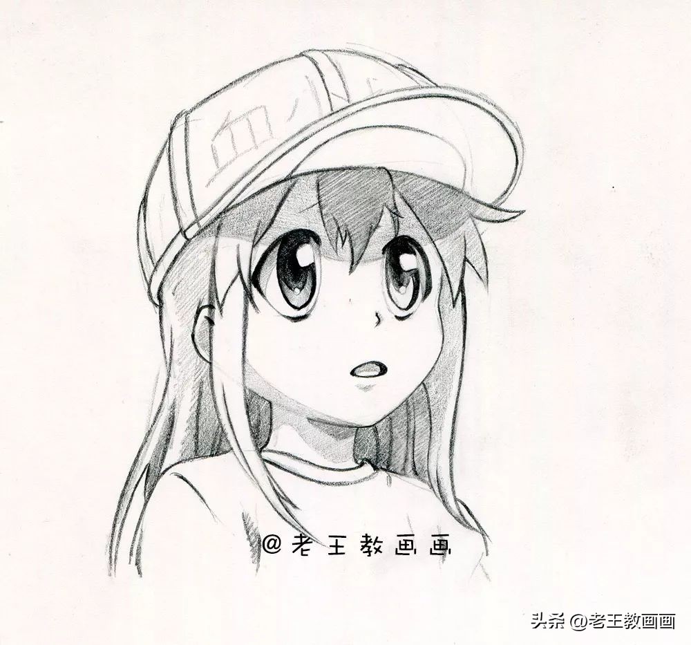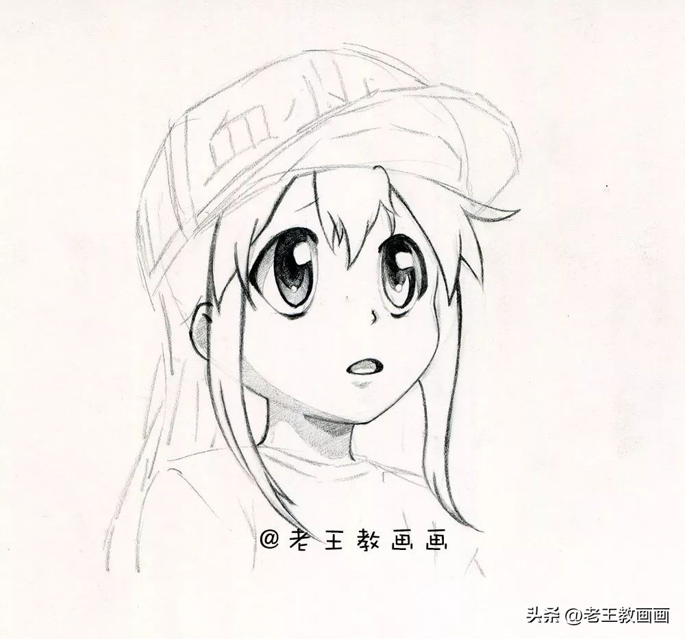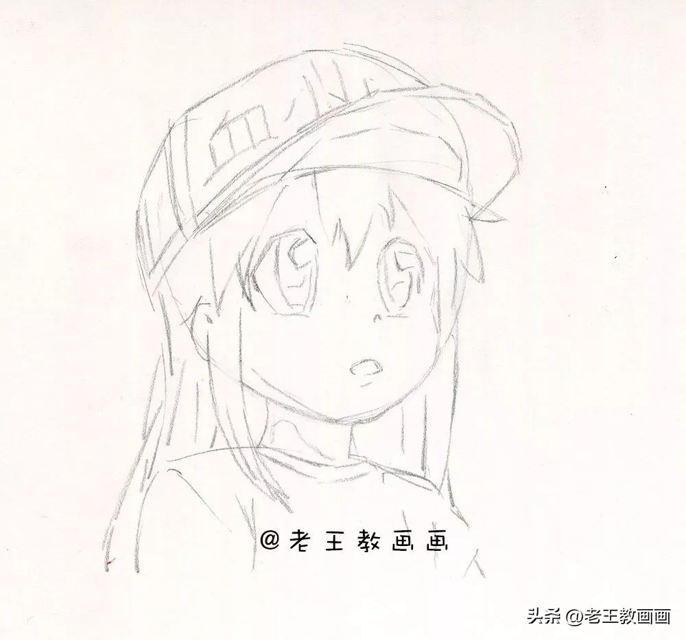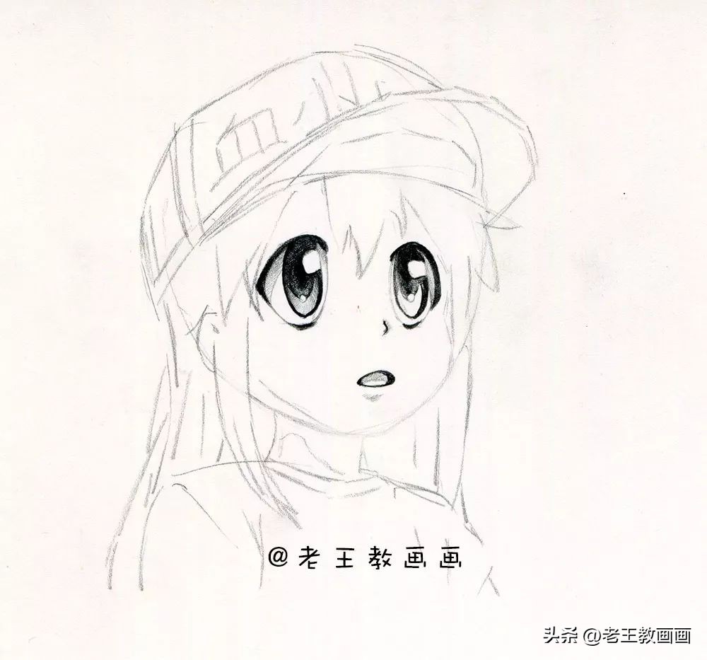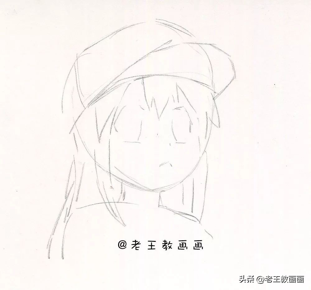 >>>【第2步】:把头发和五官的具体形体画出来,大眼睛,小嘴巴,帽子的形体画好(P2)