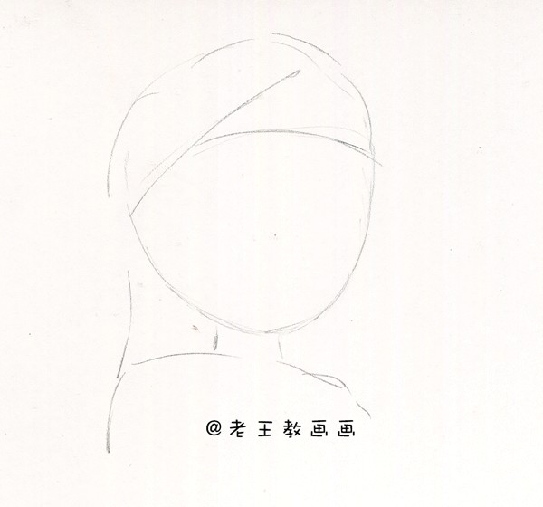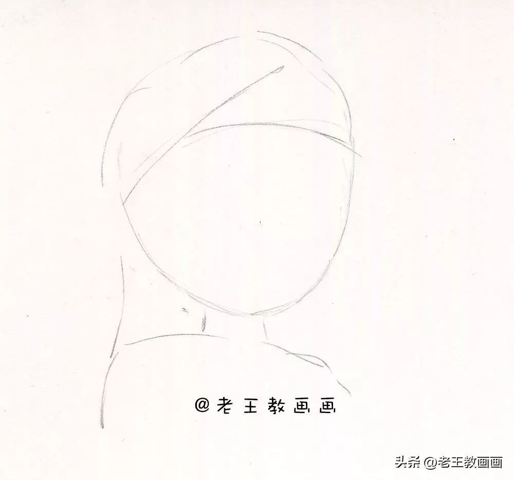 >>>【第5步】:画头发的具体形体,头发用线条表现,注意前后遮挡关系;同时画出脖子的形体,投影的灰色也画上(P5↓)