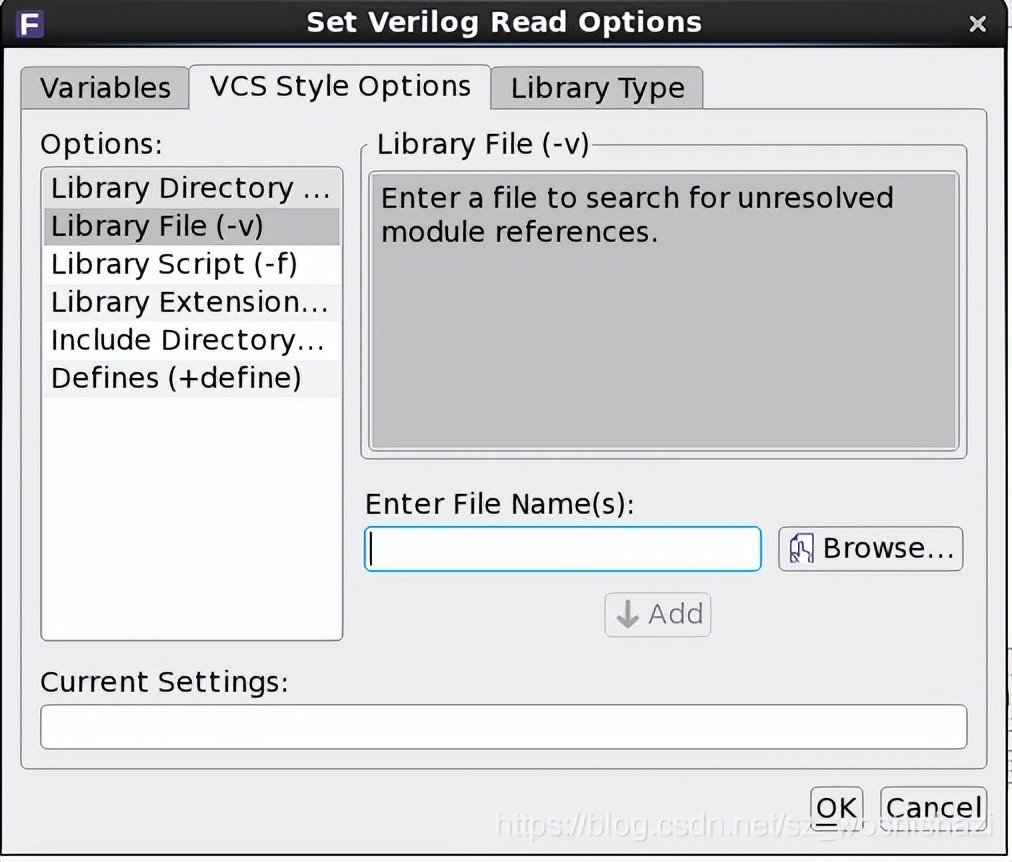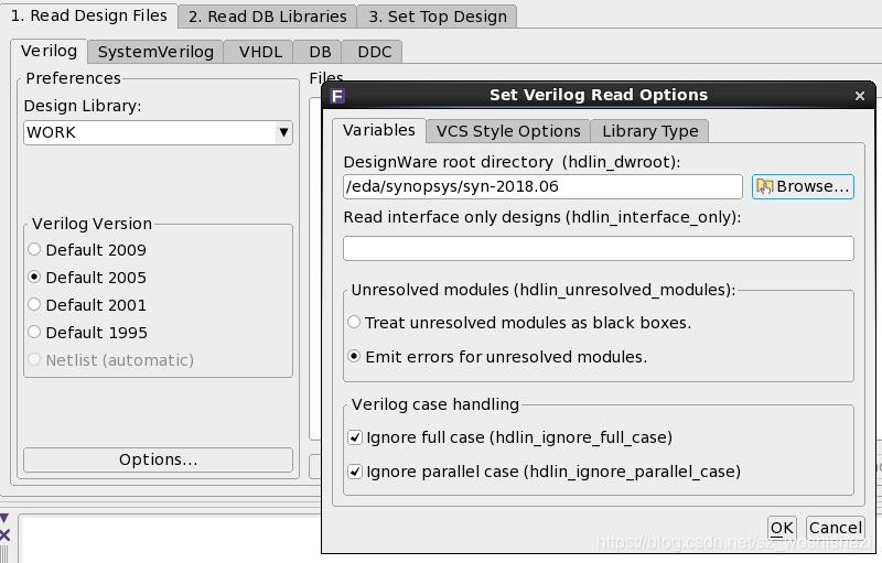 在options中的variables的designware root directory中选择DC安装的路径。在VCS style options选项卡中的library file中选择应用的工艺库的.v文件,并add。