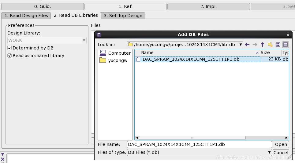 在impl栏中同样也是读入design 和 db ,只不过这里要读的是网表的design和db,和步骤二类似,如果调用了pdks的设计,也要在options中设置,而db读入过程中除了要读入IP的db,还要读入pdks的db。最后设置set top,成功后同样会出现绿色小勾。