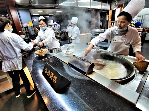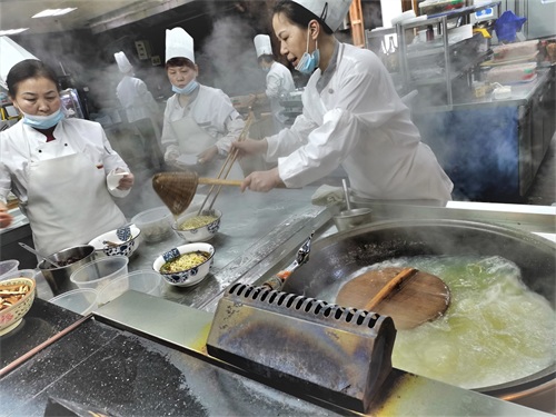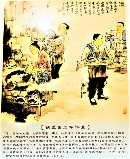 锅盖面制法 面条采用的是“跳面”,所谓“跳面”,就是把和、揉好的面团放置案板上的竹杠下,做面师傅坐在竹杠一端,另一端固定在案板上,通过上下颠跳、反复挤压,最终将面团压成薄薄的面皮,用刀切成面条。由于“跳面”有毛孔,卤汁易入味,并且柔韧性好,吃在嘴里耐嚼有劲,味道独具。