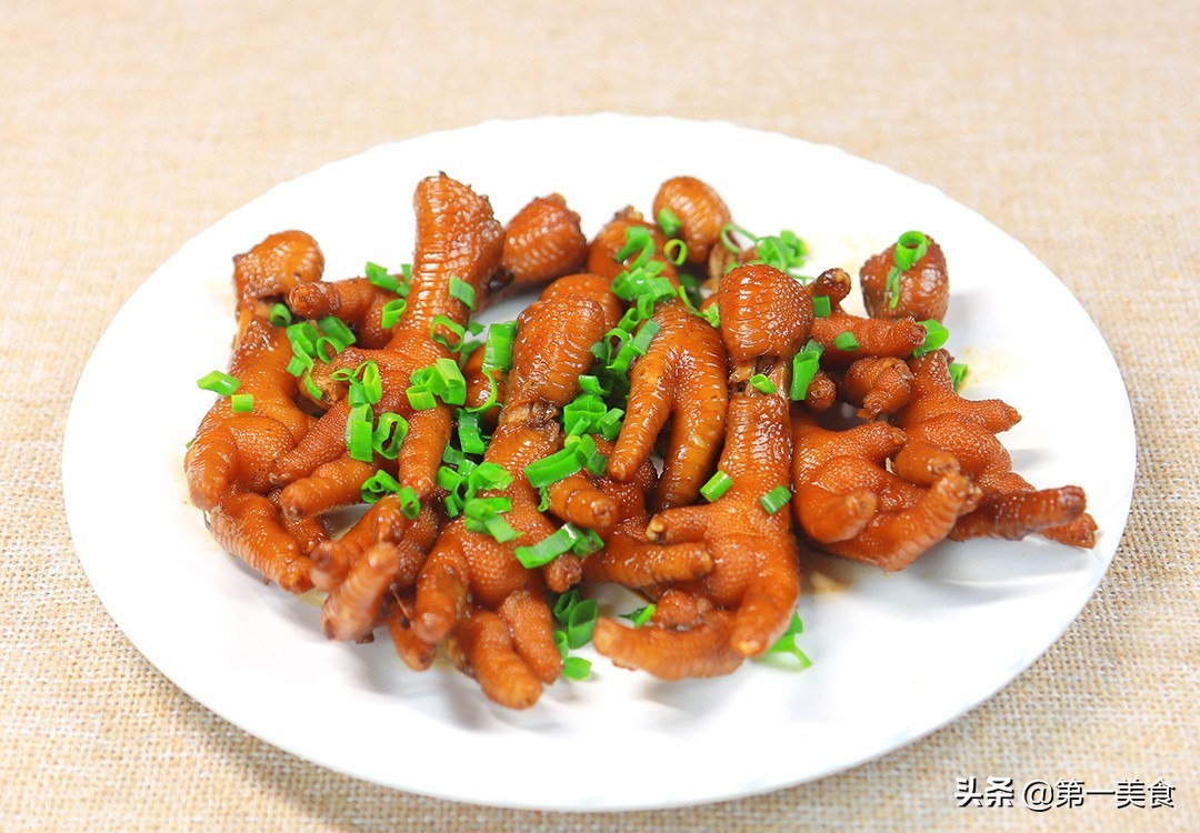 30分钟以后,汤汁已经基本收干,鸡爪红润脱骨,散发着浓浓的酱香味,把它摆放在盘中,撒上葱花就能上桌食用了。