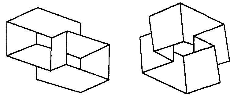 1958年美国的《心理学杂志》上,彭罗斯发表了他的不可解的三接棍,他称之为立体的矩形构造:三个直角并显示出垂直,但它是不可能存在于空间的,因为在这里三个直角似乎成了一个"三角形"但三角形是平面而非立体的图形,三个内角和为180°,而非270°。
