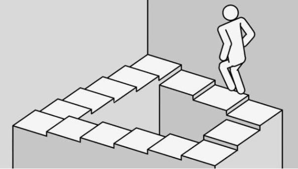 20世纪50年代,罗格和彭罗斯写了论不可能图形的文章,文章描述了一种"没有尽头的楼梯",踏着楼梯好像是一步一步地上升,然而楼梯都是停留在一个水平面上。