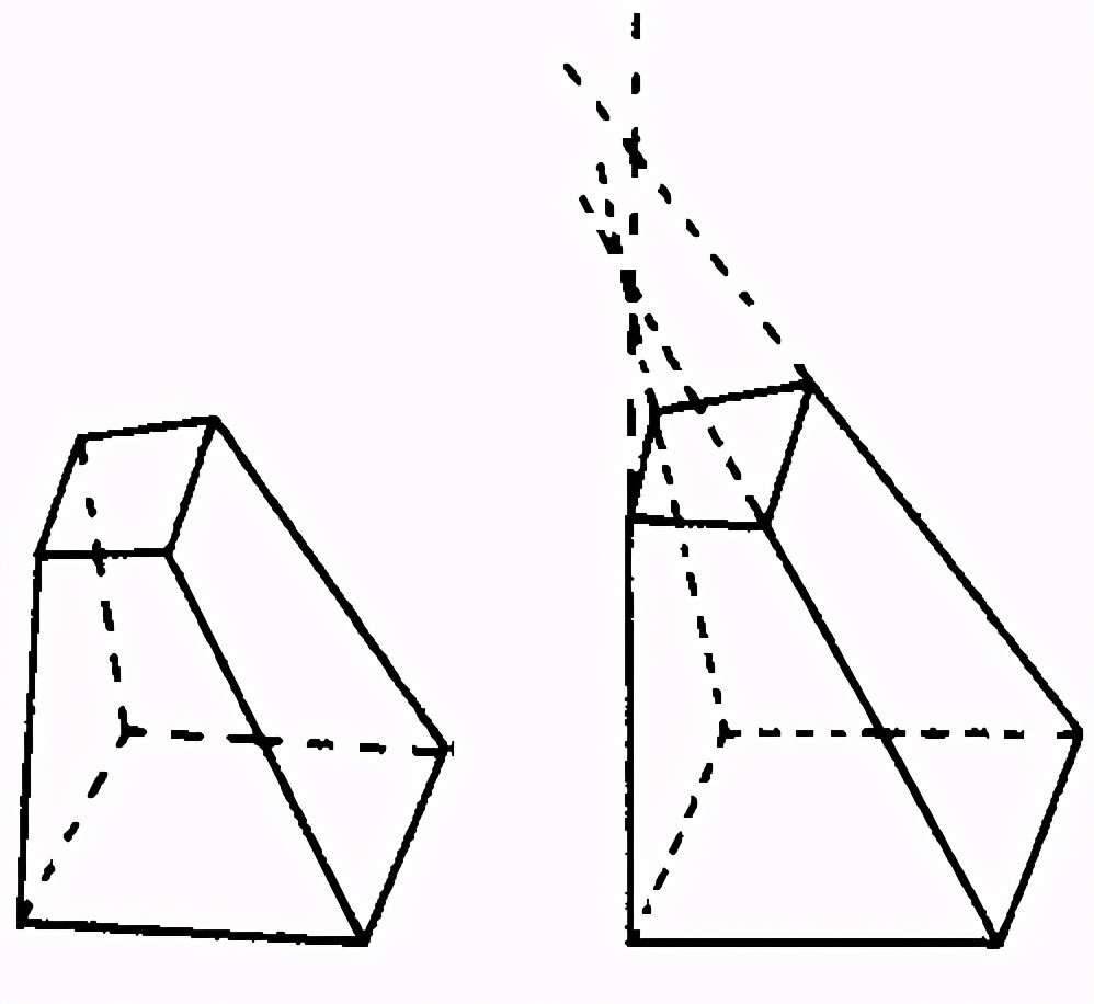 下图是一个削去顶尖的锥体——棱台,其实不是,因为将它的四条侧棱延长时,并不交于一个点,所以它不可能形成锥体。