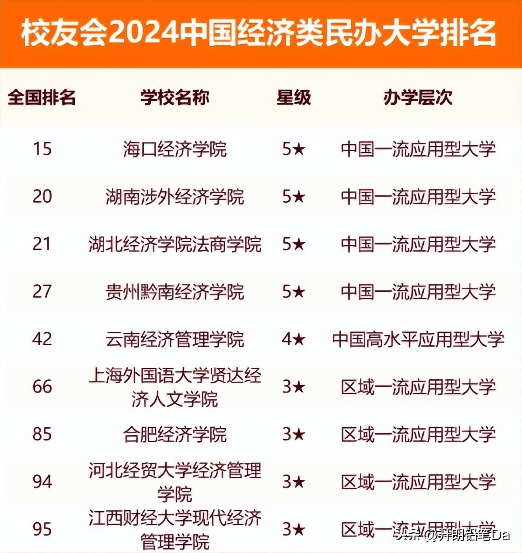 根据校友会最新全国经济类民办大学排行榜单显示,排名靠前的院校有海口经济学院、湖南涉外经济学院、湖北经济学院法商学院等。详细的校友会版2024全国民办经济类大学排行整理如下: