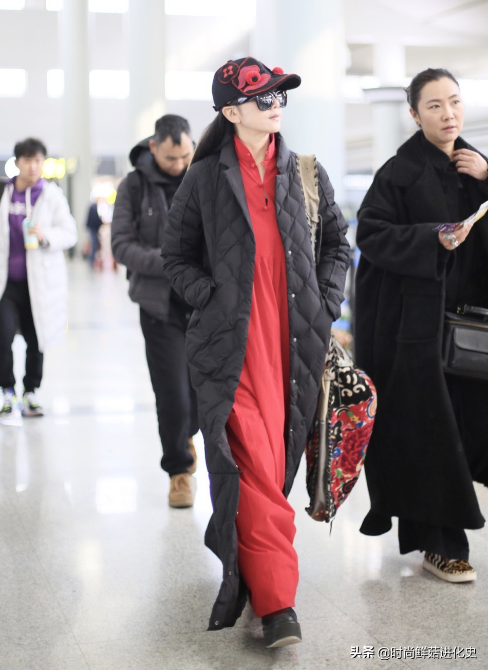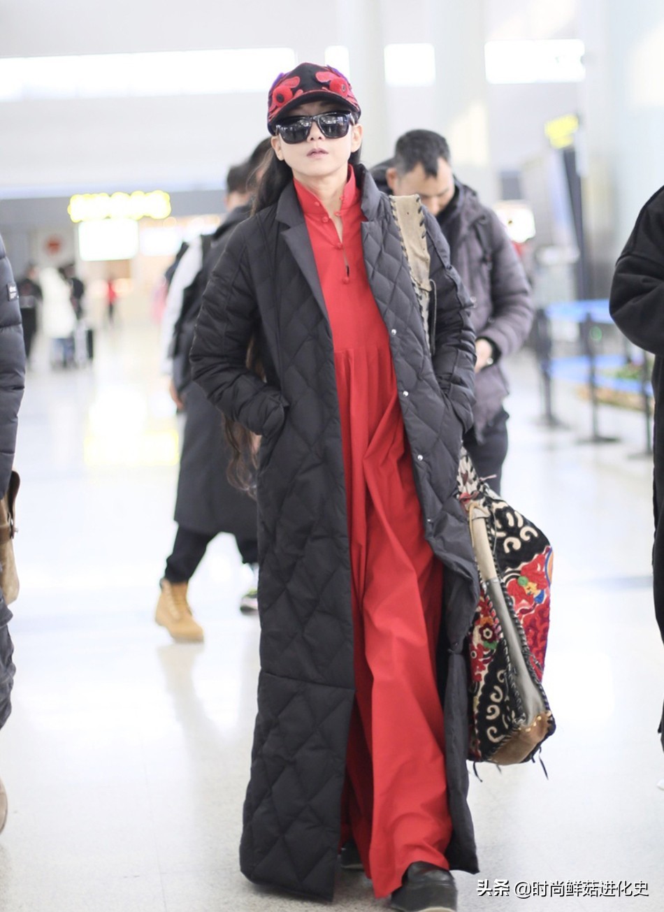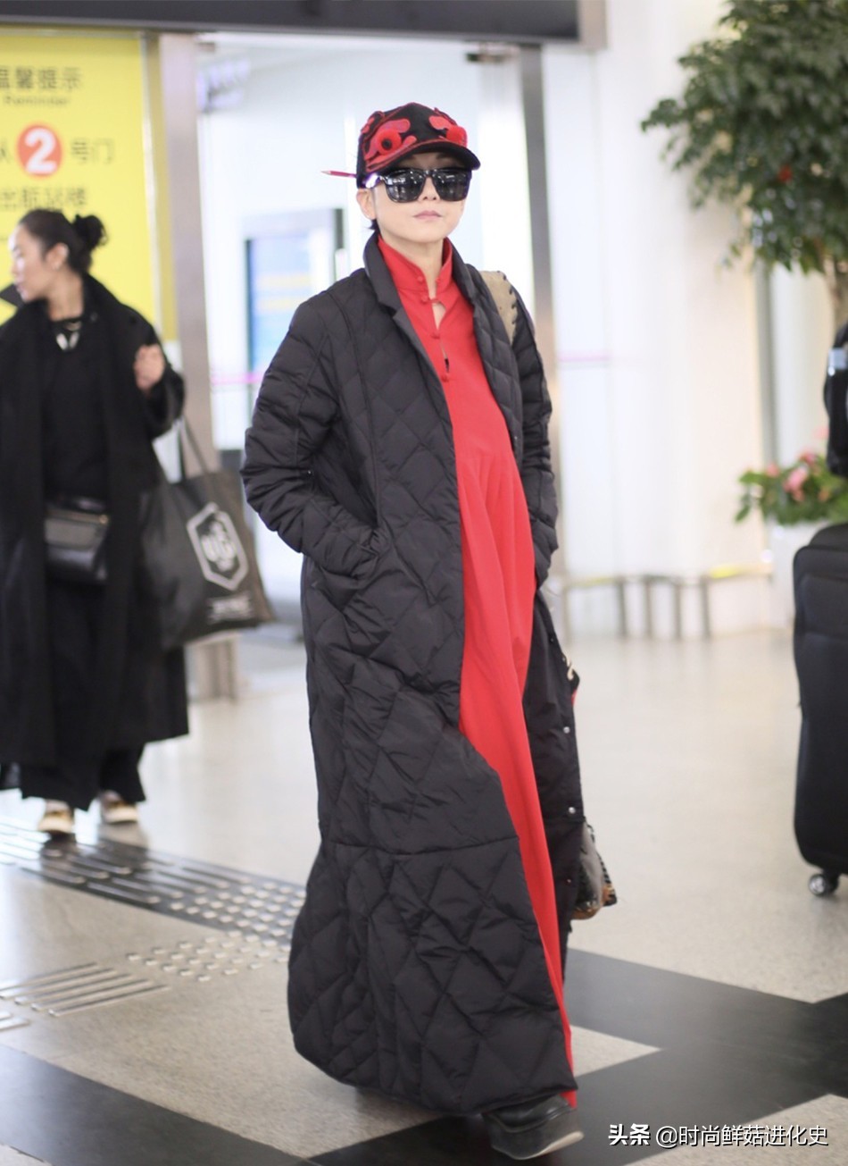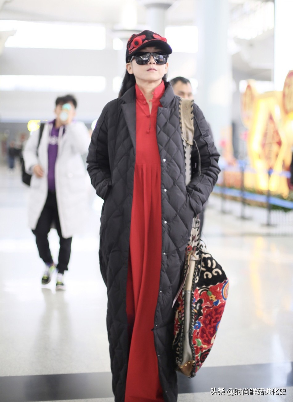 这次现身机场街拍,杨丽萍身穿这款黑色羽绒长袍搭配红色连衣长裙,其中黑色颜色百搭不挑人,亮度低,能够很好地衬托出杨丽萍脸部肤色的白皙,在视觉上能够起到一定的显白效果,整体简单大方,款式基础。