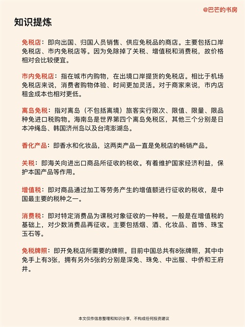 免税牌照:即开免税店所需要的牌照。目前中国总共有8张牌照,其中中免手上有3张,拥有另外5张的分别是深免、珠免、中出服、中侨和王府井。