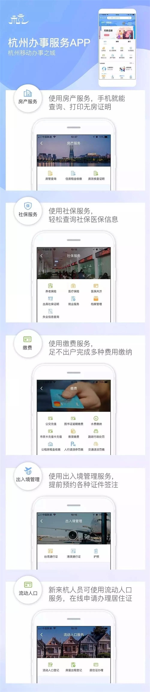 “杭州办事服务”APP中,大项涉及“热门”、“常用”、“部门”等,每个大项中又有很多具体事项。例如“热门”事项中,有“公积金”、“出入境管理”、“社保服务”、“房产服务”等事项。