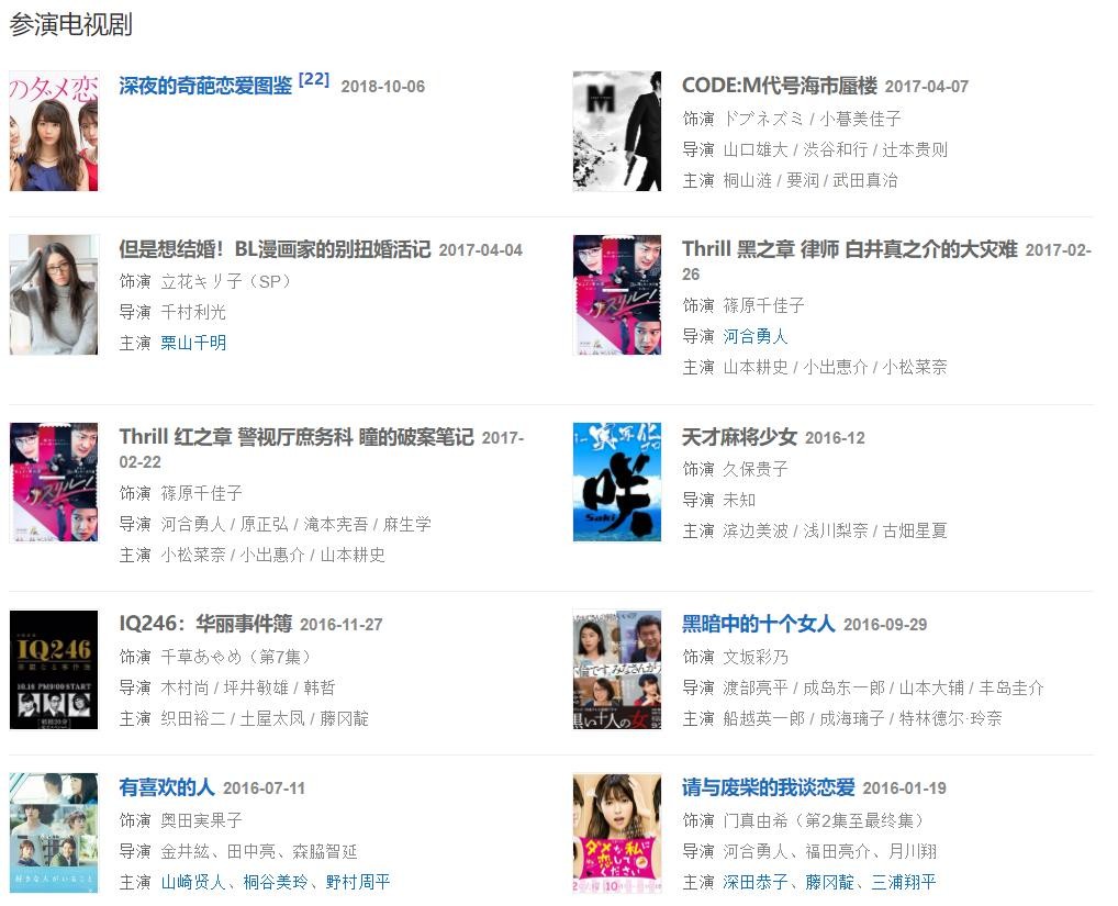 而且,外貌出众外形亮丽的佐野雏子也参与过多部戏剧的演出。从一些客串角色一路到演出日剧《死亡笔记本》、《拜托请爱我》、《娇妻出没注意》……等多部电视剧。甚至也有登上大银幕,参与过《咲-Saki-》等电影的演出。