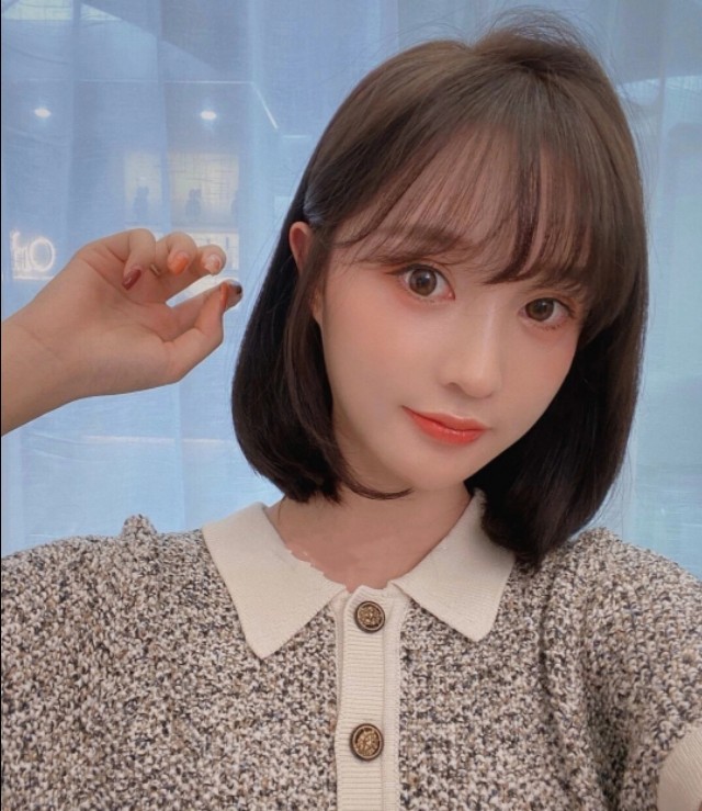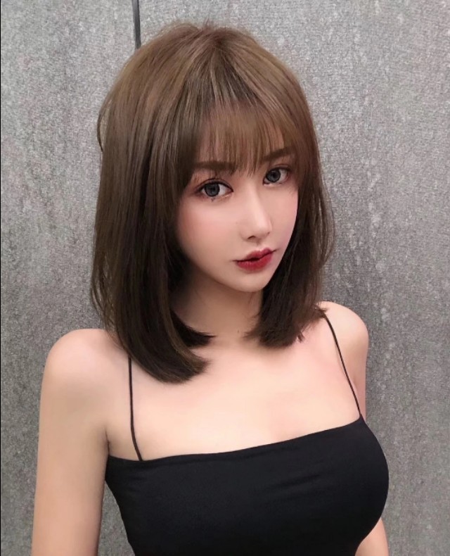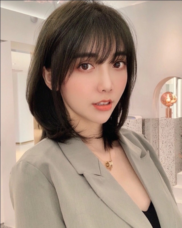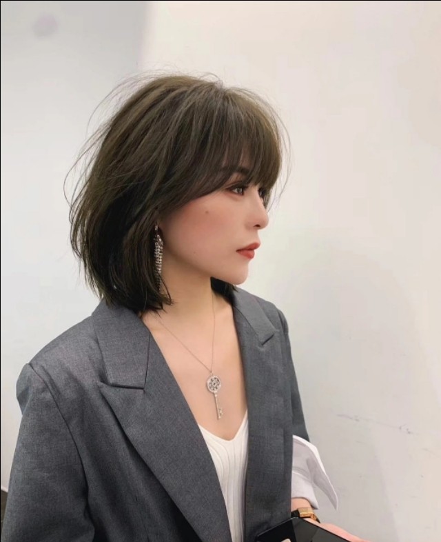 发尾处的处理真的非常别致,不是特别整齐的剪裁,这就非常适合女生发量多的特点,发量少反而没有这种效果,因为额头并不是那种宽又饱满的类型,所以刘海不需要太厚重,眉毛的位置特别俏皮,乍一看也显得很文静甜美。又非常适合职场的轻熟风女孩。