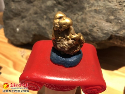 张平讲述了这块狗头金的来龙去脉。新疆南部的阿尔金山,在维吾尔语中是“金山”的意思,馆内的这块狗头金,正是出自于此。1984年6月,当地一位农民捡到了这块50多克的自然金块,后被该馆收藏。因为是珍贵标本,在1984年到2013年期间,馆内展出的是这块狗头金的复制品,直到2013年6月18日,珍藏多年的这块狗头金才被人们从保险柜中取出,陈列在展厅。