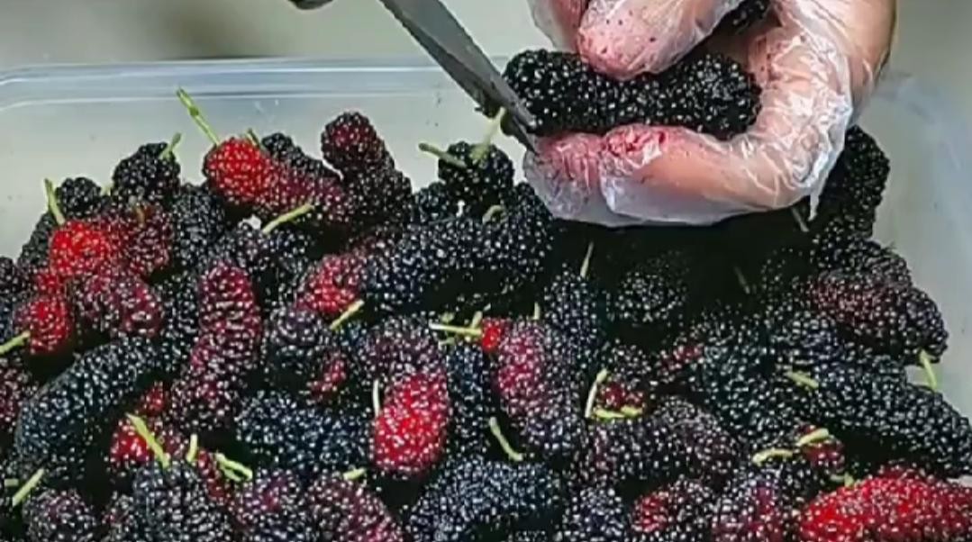 把摘好的桑果用清水清洗一遍,然后加入食用盐,浸泡10分钟,可以更好的去除桑葚中的虫、有害物质等等。晾干桑果的水分,把果蒂剪干净备用。