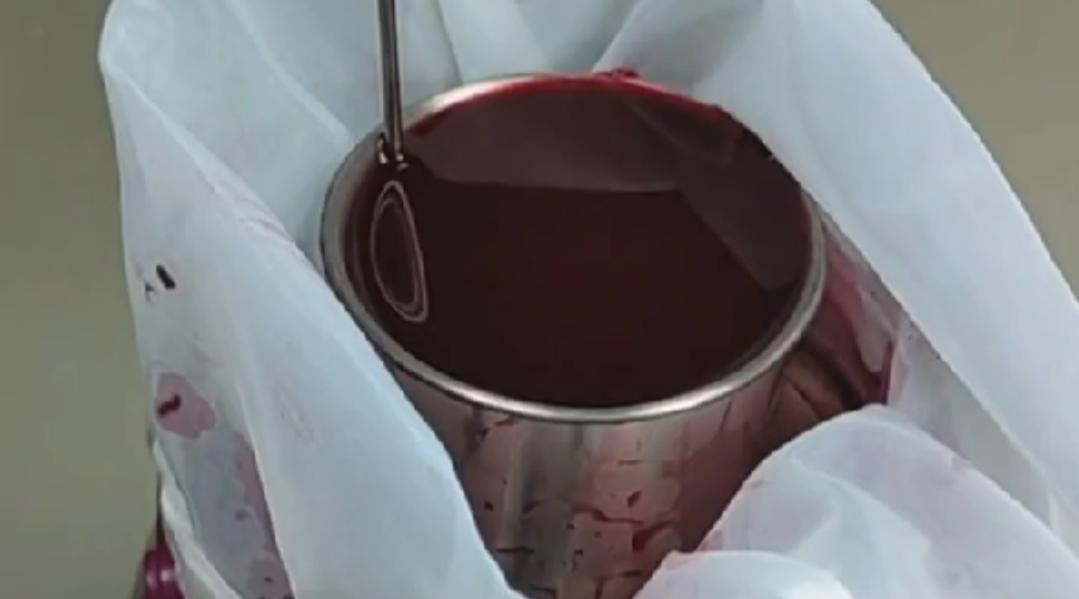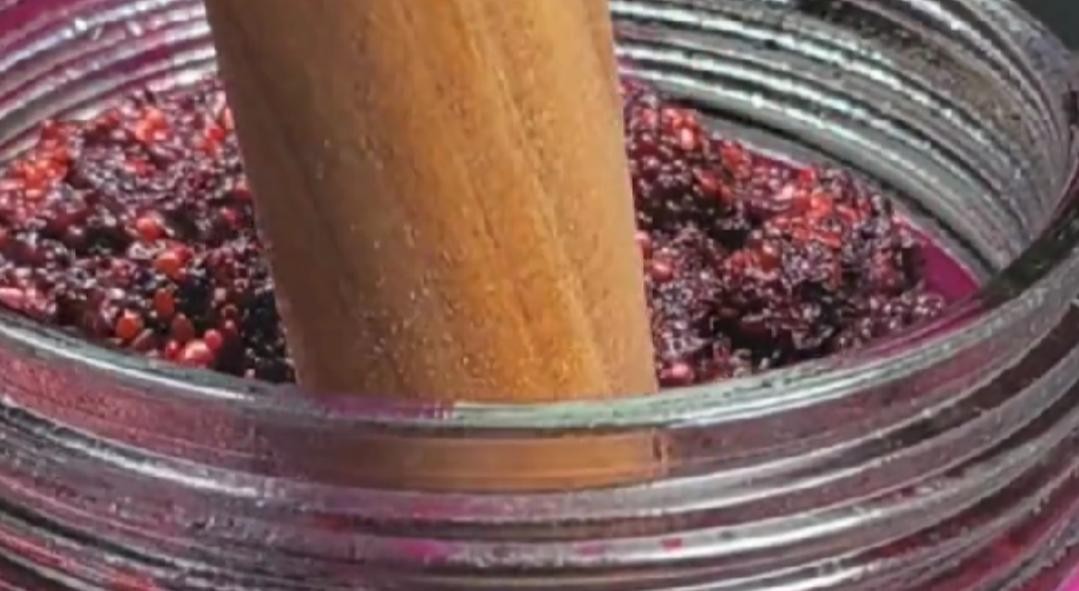 一天过后就可以看到产生大量的气体,果肉也漂浮到上面了,然后用擀面杖把果泥压到果汁里面。发酵的过程中要每天搅拌一次,发酵三到五天,发酵到果肉没有漂浮起来就可以了。