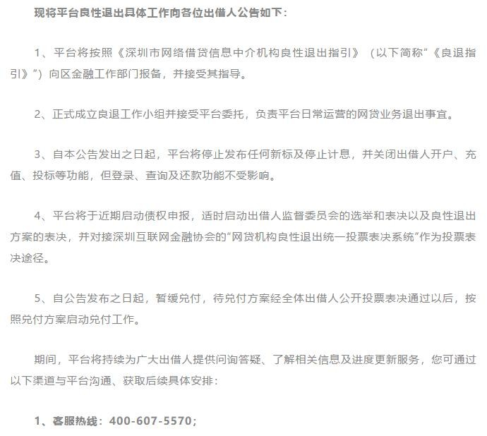 公告内容表示,近两年来,网贷行业经营环境恶化,出借人的投资风险及平台的经营风险增大,全球新冠疫情极大地增加了未来的不确定性,各大网贷平台都陆续退出,经过深思熟虑,我们也决定退出网贷行业,逐步结清存量网贷业务。