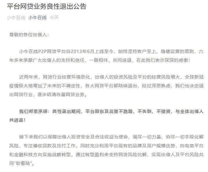 刚刚!小牛在线终于扛不住了!宣布退出网贷行业