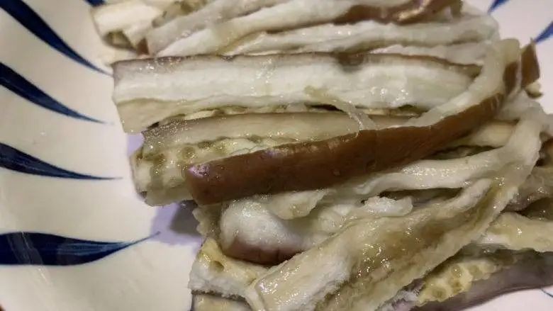 2、 等茄子凉透之后,将茄子手撕成条状(茄子在蒸煮的过程中会吸收水分,建议在手撕前可以先挤掉多余的水分,不然水分太多,料汁会打折扣)