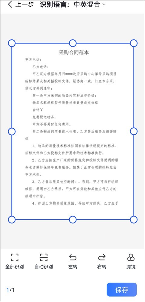 第三步:预览界面,可以点击图片上的蓝色线框,拖动进行局部识别操作,点击右下角“保存”;