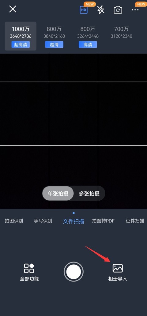 第二步:手机会自动开启摄像模式,上方的“HD”选项,则是可以提供最高1000万的超高清拍摄,对准需要扫描的文件,拍摄下清晰的图片,或者点击右下角进行“相册导入”;