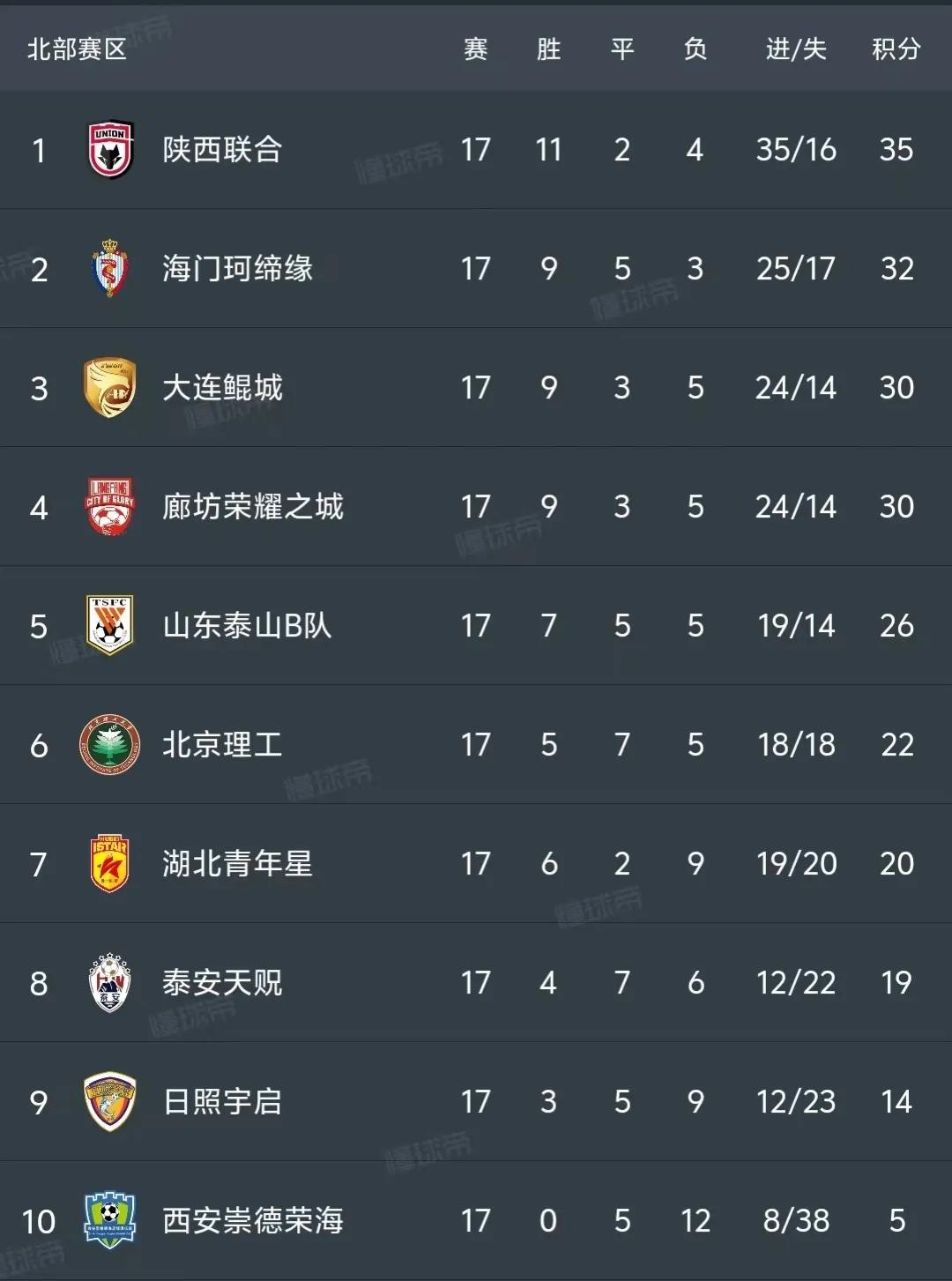中乙北部赛区最新积分榜:陕西联合排第一,大连鲲城廊坊同积30分