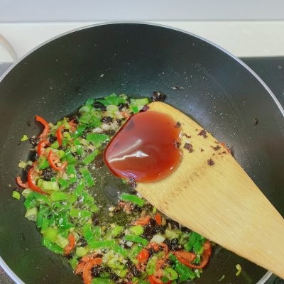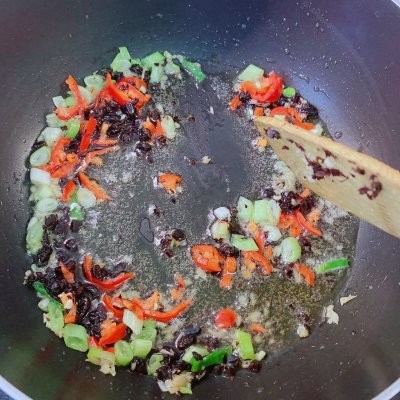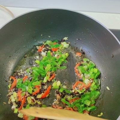 10、下入辣椒碎和豆豉炒香